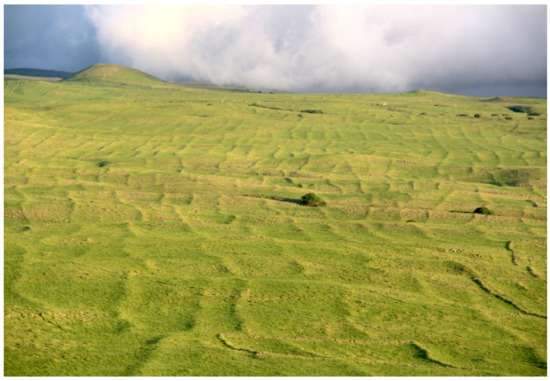 A considerable portion of the area devoted to rainfed cultivation occurred in vast, intensively developed “systems,” such as the Leeward Kohala Field System (Figure 2). These intensive systems were confined to areas with high natural soil fertility [9,56] and adequate rainfall, mostly on the young islands of Hawai‘i and Maui [19]. These field systems are defined by common elements of agricultural infrastructure, including long linear embankments and built stone mounds, although considerable diversity in form and application of the infrastructure is evident. Embankments were planted with taller crops such as kō (sugarcane, Saccharum officinarum), mai‘a (plantain/banana, Musa spp.), and kī (ti, Cordyline fruticosa), and bordered cleared fields containing the primary staples of kalo, ‘uala (sweet potato, Ipomoea batatas), and ‘uhi (greater yam, Dioscorea alata). These continuous systems occupied vast areas on the younger islands; the largest of which was likely the Ka‘ū system that may have covered over 50,000 acres [11,19]. Portions of these systems were likely farmed seasonally based on patterns of rainfall and temperature [12,13].