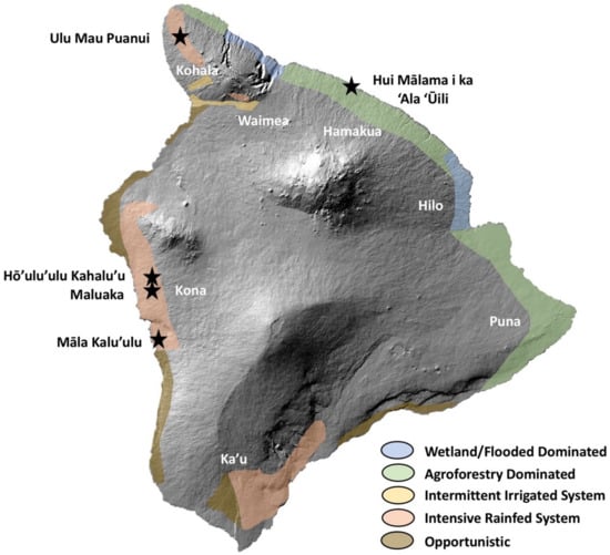 Location of the five organizations focused on restoration of traditional dryland agriculture and a depiction of the general patterns of agricultural reliance of Hawai‘i Island estimates by ethnographic sources, archaeological surveys, and biogeochemical models. It is important to note that the forms of agriculture presented are only the broad categories of the dominant forms applied, and many nuanced variations within any area occurred, including areas that do not depict any agriculture. For instance, in Kona, although dominantly rainfed areas of spring-fed, flooded or irrigated cultivation occurred, along with areas of agroforestry.