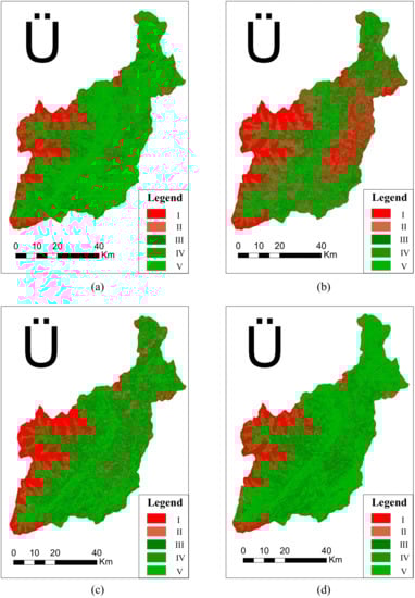 Evaluation results of ecological security in (a) 2007, (b) 2008, (c) 2013, and (d) 2017.