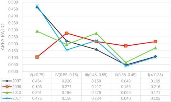 The area ratio of each ecological security level area was calculated, and results are shown in Figure 3. It can be seen that the area ratio of ecological security grade V was over 40% in 2007 and 2017, and close to 30% in 2013, which was the largest-proportion ecological safety type in these three years. In 2008, the largest-proportion ecological security level was IV. The area of ecological safety grades II and I accounted for 40.05% of the total area in 2008. According to Figure 2, these areas were mainly distributed around the Lancang River and in the western mountainous region of Wenchuan County, and this value decreased to 23.65% in 2013.