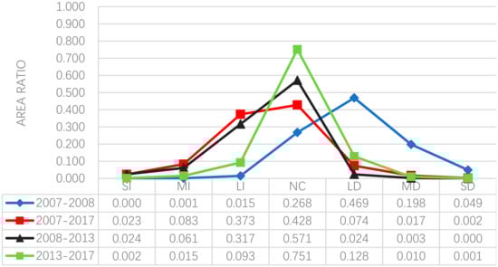 On the basis of the hierarchical division of the ecological safety correlation degree, we calculated the ecological safety difference for each of two years in 2007, 2008, 2013, and 2017, and divided the ecological safety change into 7 levels according to the results: significant deterioration (SD), moderate deterioration (MD), light deterioration (LD), no change (NC), light improvement (LI), moderate improvement (MI), and significant improvement (SI).