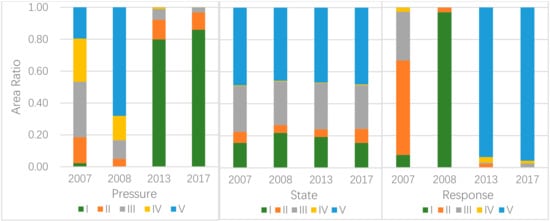 Comparing the ecological security of the pressure layer in each year, the area of ecological security above the “critically safe” level accounted for 81.5% in 2007 and 95% in 2008. In 2013 and 2017, the “very unsafe”-level areas accounted for the largest proportion, reaching 79.8% and 85.9%, respectively.