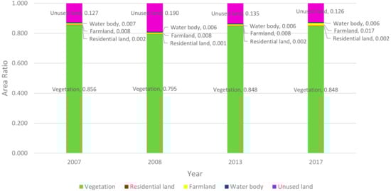 Area ratio of different land types in 2007, 2008, 2013, and 2017.