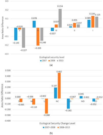 Difference between results obtained in this study and those obtained by Cao et al.: (a) area-ratio difference of different ecological levels in 2007, 2008, and 2013; (b) area-ratio difference for different ecological security change levels for 2007–2008 and 2008–2013.