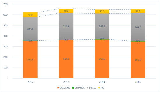 Table 7 and Figure 3 display the CO2eq GHG emissions inventory of the urban transport sector, according to the type of fuel, between 2012–2015.