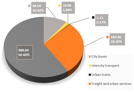 There is little current relevant data for municipal freight transport in PlanMob. The data available are from 2007, which is from an Origin–Destination survey carried out in the municipality [55]. No updates to this data in PlanMob 2017 were carried out. According to the 2007 O–D survey, 35,226 truck trips are carried out daily, of which 13,073 were internal, 6901 originated in the municipality, and 6601 had the municipality as their destination. This 2007 data was used for a bottom–up estimation of fuel consumption [40], considering a mean fleet age of five years [48], heavy diesel trucks for intermunicipal transportation, medium-sized diesel trucks for internal transport, and a transport distance corresponding to the approximate extension of the municipality, at its largest dimension of 25 km for internal transportation, and half of this value, 13 km, for intermunicipal transportation. This estimate was compared to diesel sales in the municipality in 2007 in order to quantify the weight of this sector for the same year (Table 4). Due to the precariousness of the data update, the cargo sector was joined to other urban public service sectors that use diesel vehicles, such as private bus transportation and leased minivans (transfers), public maintenance services, garbage collection, and school transportation.
