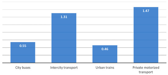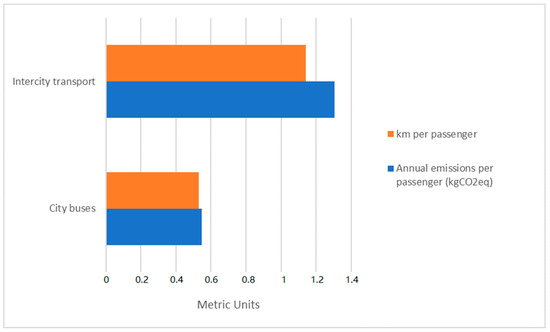 Figure 6 compares intermunicipal public transport with that carried out within the municipality. In addition to emissions per passenger, the mileage traveled per passenger—which is higher in intercity transport—was also analyzed.