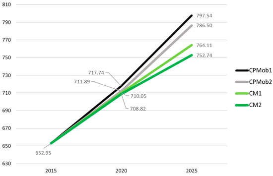 Obtained urban transport CO2eq emissions in Natal: scenarios for 2020 and 2025. CPMob1 and CPMob2: Urban Mobility Plans’ total CO2 emissions for Netal for 2020 and 2025, respectively. CM1 and CM2: data for the proposal of a further two scenarios focused on reducing GHG emissions based on public urban mobility policies and more intense actions, respectively.