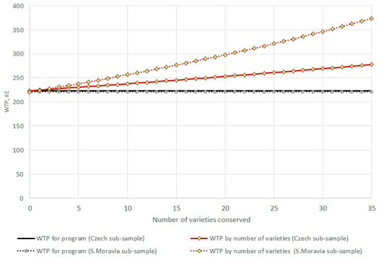 The implied mean WTP is 223 Kč ($9.06) and this value only captures benefits for the conservation program, regardless of the number of varieties. We show in Figure 1 below how mean WTP changes based on the number of varieties conserved by the program. Note that respondent WTP was more sensitive to the number of varieties conserved in the South Moravian sample, where mean WTP increases to 373 Kč ($15.16) for the maximum number of varieties, while only increasing to 278 Kč in the general Czech representative sample.