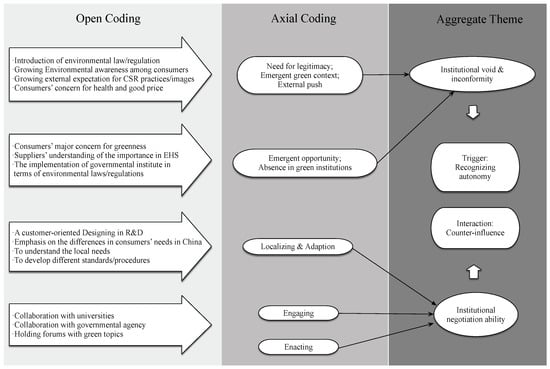 Initially, we were interested in how firms respond to opportunities and challenges amidst growing concern for development of sustainable/green business practices. Existing literature suggested that such processes could be context specific. We conducted exploratory pilot interviews to better comprehend the institutional environment for development of sustainability practices in the Chinese market. We interviewed four prominent corporate leaders and consulted three industry experts to obtain their perspectives on the development of corporate sustainability and CSR practices in China. These interviews were purposely broad in scope and touched on topics such as motivations behind sustainability-related efforts, limitations of resources and governmental regulations, market potential, and organizational innovation procedures. During these interviews with industrial leaders and experts, the contour of institution (e.g., regulative system of environmental protection and industrial standards/norms) supporting sustainability development in China emerged. Following interviews with employees and decision makers from case companies helped us to identify the notions of non-conformity and voids in institutions that influence firms’ sustainability-related practices, and find out the corresponding corporate strategic responses. These findings lead us to investigate such aspects with further interviews. In order to enrich our understanding of the innovation and localization processes, we conducted formal interviews in Chinese, which were recorded, transcribed, translated, coded and analyzed with the support of Nvivo [45]. During the analytical process, we conducted open coding and axial coding, and aggregated themes surrounding an interactive innovation process (Figure 2). The key findings are presented in the following section.