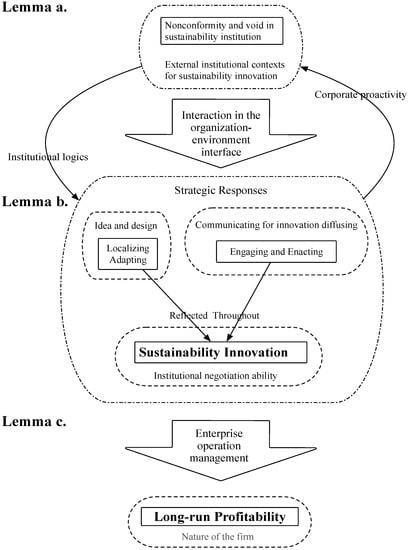 Corporate sustainability can be seen as the result of institutional negotiation conducted by motivated actors with insufficient institutional resources or support [46,47]. For maintaining their sustainability strategy and green innovative projects under the pressure of isomorphism, firms should first be familiar with or embed themselves in the institutional logics; based on that, firms need to be able to leverage and mobilize support for their innovative sustainability practices from very different actors and constituencies with their agency actions. Actions and ideas adapted for green innovation products need to be consistent with established practices and expectations in the market, and fit better into established customer norms. Thus, we propose the following Lemma 1 to describe the initial part of the framework.