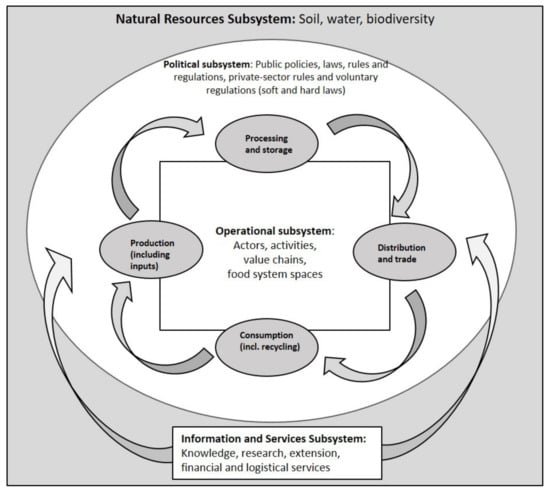For our understanding of “food system,” we consider more than food flows or agri-food value chains because we focus on actors and because material and immaterial context features are fundamental parts of food systems. Among these are (i) the natural resource base of a food system; (ii) the flows of information and services (e.g., financial); and (ii) the political context of a food system (including, e.g., international trade agreements) (see Reference []). While it is possible to conceptualize one global food system (e.g., Reference []), there are a wide range of (strongly differing) forms of production, processing, distribution, and consumption in place in a given area, with different outcomes in terms of the right to food or sustainability. For comparative purposes, it therefore makes sense to distinguish between different types of food systems according to their modes of production, distribution, and consumption not only spatially (e.g., local, national, regional, and global), but also qualitatively, e.g., based on their degree of reliance on external inputs. Colonna et al. [] differentiate between (1) agroindustrial food systems, (2) domestic food systems, (3) regional food systems, (4) local food systems, and (5) differentiated-quality food systems [].