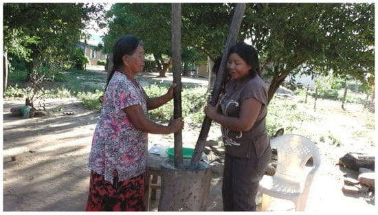 The Guaraní communities we researched had a collective ownership structure within their TIOC defining access to, protection of, and responsibilities regarding communal resources. This applied, e.g., to food production (including usufruct rights for land use for individual families), and to reciprocity mechanisms (e.g., community work, known as faena or motirõ), which required a formal invitation and the provision of food and the maize drink chicha, and could not be declined []. Sharing food was described as a usual mechanism in the Guaraní communities of Takovo Mora (ibid.).