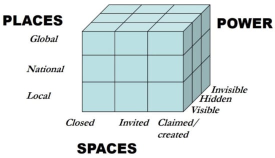 The spaces and forms of power can be located on at least three different levels, in power cube terminology known as local, national, and global places, which imply a notion of boundaries and the level at which participation takes place (or not) [], and whether power processes are top-down or bottom-up (Ibid.). Globalization and decentralization processes can also be located in this power dimension.