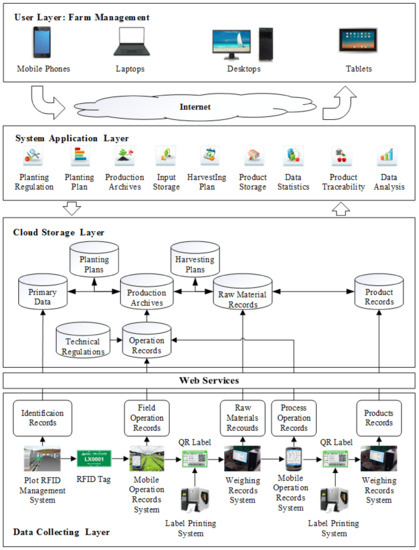 The DFMS concept based on a cloud computing platform was proposed to enable information-based management on farms, which includes the tracking of the production process and the tracing of product quality. As shown in Figure 2, the system has a distributed five-tiered architecture, which is divided into a data collecting layer, a web service layer, a cloud storage layer, a system application layer, and a user layer.