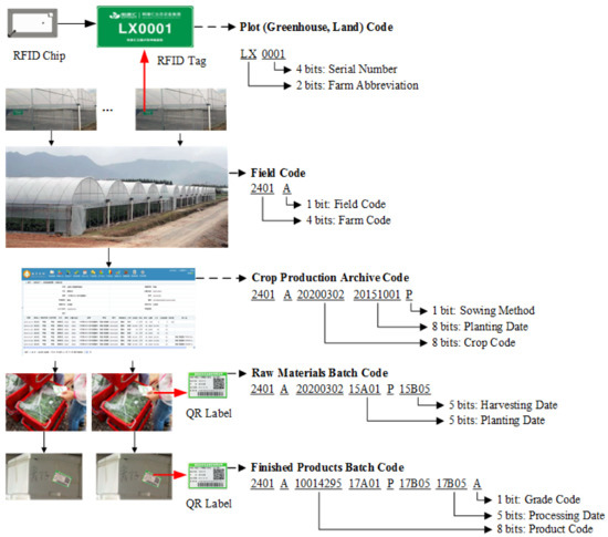 After raw materials are picked and harvested, traceability is possible only when the harvest batches are encoded properly to ensure that they are properly associated with the production archive. As shown in Figure 3, a batch code of materials is generated at the harvesting stage, which is designed with five sections (field code, crop code, planting batch code, sowing method code, and harvesting batch code). Five bits identifying the harvest code are added based on the production archive batch code. As shown in Figure 2, when the raw material is picked and harvested, the harvest labels containing harvesting batch codes are printed based on the daily harvest plan and subsequently affixed to the container that holds the harvested batch.
