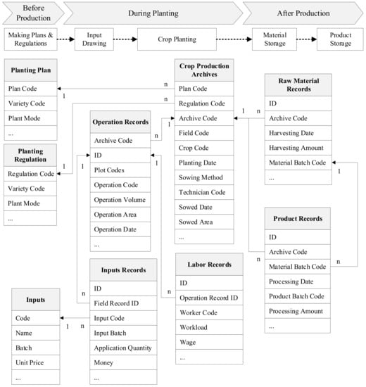 Figure 4 shows the relationships between different stages in the product lifecycle. Planting technical guidelines describe field production protocols, and they are therefore an important basis for production process evaluation. Production archives are created for each batch of every crop, which are related to guidelines and plan codes. The production archive is uniquely identified by the archive code, which is comprised of the field code, crop code, batch code, and sowing method code. In the field planting phase, operation records of field activities (soil preparation, sowing, pruning, fertilization, spraying pesticide, and harvesting) are entered into MORS and immediately uploaded to DFMS via Wi-Fi, 3G, or 4G networks. These records on the same plot are correlated with the same crop archive code. Additionally, the input batch is recorded in input records. The raw material harvested from the same planting batch has the same harvesting batch. After harvesting, the raw materials are delivered to the farm processing center. Each batch of raw materials may be processed according to batch, and there will be multiple product batches, which are related to the harvesting batch. Therefore, we can find all the information about the whole product lifecycle through these links. Furthermore, based on planting regulation and operation records, the evaluation results of the production process and traceability information can be obtained.