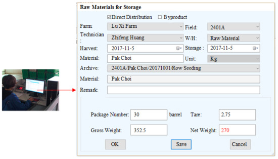 Harvest labels containing harvest batch codes are printed with LPS based on the daily harvest plan and are subsequently affixed to containers during the harvest. After harvesting, the agricultural raw materials are delivered to farm processing centers. As shown in Figure 6, scanning the harvesting QR labels, the basic information (e.g., farm, field, technician, and archive) are automatically filled into the boxes. The material weight is automatically obtained from weight sensors, and the record is related to the production archive by parsing the QR code. One batch of the materials may be divided into several batches for processing into products. Each batch product is identified by process batch and grade.