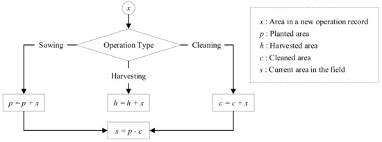 The farm managers can be aware of the implementation of the plan, the future harvesting area, and the vacant area and then make efficient decisions using the statistic functions in DFMS. The statistical areas (i.e., planted area, harvested area, and cleaning area) are automatically calculated when the field record is uploaded to DFMS. These processes for calculating these areas is shown in Figure 8, and planted, harvested, or cleaning areas will be incremented by x according to the new operation type. In addition, the month weighted area is used as an allocation key to calculate indirect costs (such as rent and management fees), which are calculated according to the actual ground time. The monthly weighted area can be expressed as: