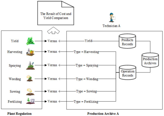 The analysis of production performance is an effective means to control the production process, including inputs, labor costs, and obtained yield. The planting cost of the entire planting cycle and yield of a single crop are statistically calculated in DFMS at the end of a production cycle. The planting costs specified for each set of standardized planting guidelines and in every batch of products are compared according to the planting operation type. Planting operations can be divided into predefined types: base fertilizer, soil preparation, sowing, watering, spraying insecticide, and weeding. Figure 9 illustrates the analysis flow for the production cost of a batch crop compared to technical planting guidelines. The cost of each planting phase is accumulated by the operation type of corresponding field records. For example, the sowing cost is calculated by assessing records in which the operation type is sow. Then, the costs are compared across planting procedures, and the production process is strictly controlled.