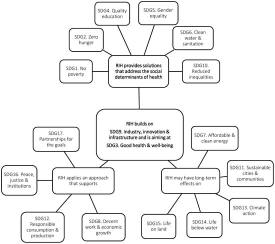 First, at the top of this Figure are located the SDGs that form important purposes for RIH. This group of SDGs underscores how RIH could address several key determinants of health: It may contribute to SDG1 (No poverty), SDG2 (Zero hunger), SDG4 (Quality education), SDG5 (Gender equality), SDG6 (Clean water and sanitation) and SDG10 (Reduced inequalities). This principle is compatible with recent findings from Strezov and colleagues [32] for whom “public health may be the single most important overarching precondition of sustainable development”.