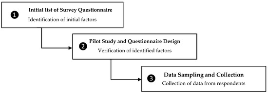 In this research, the philosophical stance of positivist epistemology was chosen, which is consistent with the objective of the study for testing the proposed hypotheses. The proposed philosophical position considers reality objectively, which can be realized empirically [56]. However, in this research, the survey method was used for the quantitative data collection to achieve the positivist goal as suggested by Saunders et al. [56]. The survey questionnaires were filled by experts of the Pakistani public sector construction industry, and the data collection was performed following the three steps described in Figure 4.