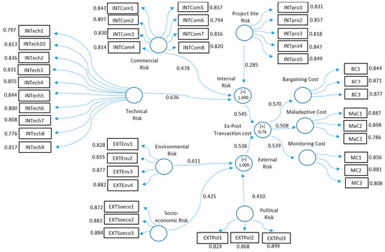 However, the beta coefficient (β) value describes the strength between exogenous and endogenous latent constructs. The higher the value of variance, the higher the effect will be. Table 6 and Figure 5 shows the calculation results and comparison of both internal risk (β = 0.545) and external risk (β = 0.538) on ex-post TC. Both risks significantly influence the risk of ex-post TC.