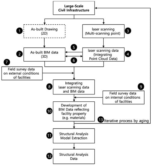 In general, facilities requiring precise structural safety diagnosis are often very large, such as tunnels [5,11] and bridges [3]. In addition, there are many complicated cases such as the production line inside the plant (e.g., nuclear power plant pipeline) [6], and the infrastructure (e.g., pipe rack) that supplies the production resources [7]. The prevalent method of safety inspection derives risk factors through comprehensive visual inspection, operational status check, and diagnostic equipment based on checklists for each facility and type of infrastructure. This process of safety inspection requires the long-term input of numerous personnel [4,12]. As this method involves the inspection of large-scale civil infrastructure through separate measurements, it is challenging to obtain consistent results of inspection, because the outcomes of safety diagnosis can differ depending on the capabilities of the engineers. Furthermore, safety diagnosis is performed while the facility is in operation. Therefore, the diagnosis itself entails high risk [13]. Although the data generated in each step of safety diagnosis are in varied formats and large in number, they lack consistency and, thus, are not easily manageable. In particular, in case of aging facilities, field surveys, status assessments, and safety assessments are challenging because the design information is not properly managed, and it is difficult to find the history of the modification of the facility. Moreover, sufficient information concerning the status of a facility that can be used for safety diagnosis is not available.