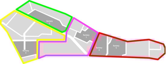 Ulsan plant of the H company was used for the case study of this research. The case project is the largest single factory in the world with an area of 5,000,000 square meters. The Ulsan plant consists of five finished car factories, engine and transmission plant, and road driving/crash test site that can be independently produced. It is the largest single factory in the world, producing an average of 5400 vehicles a day. It is a large-scale civil infrastructure that can cause enormous losses economically if production safety is interrupted due to facility safety problems. The factory was built from 1968 to 1975. Thus, the factory required structural safety diagnosis of the facilities owing to aging. Especially, the scope of the case project is a structural safety diagnosis for pipe racks. The pipe racks of the factory represented pipes and racks used for raw material transport inside the factory. Figure 2 shows the layout of a case study project for a pipe rack. Yellow, green, pink, and red indicate the path of the main pipe rack.