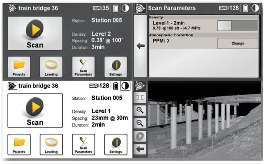 Furthermore, the scanner supported an intuitive and simple touchscreen interface as shown in Figure 3. All functions of the scanner could be controlled via the touchscreen. Constantly accurate data could be acquired regardless of weather conditions. The scanner could be used in combination with images from high-resolution cameras and point cloud data. The applications of this 3D laser scanner are wide-ranging, including surveying, industrial facilities, civil infrastructure, mines and quarries, deformation monitoring, quality control, urban environment, building as built, building MEP, BIM, and VDC, tank calibration/inspection, preservation and restoration, and public safety and forensics [52].