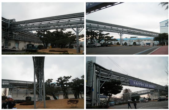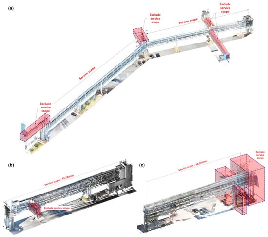 Therefore, as shown in Figure 6a–c, complicated areas where the pipe rack path changes or facilities are integrated are excluded from the structural safety diagnosis. Figure 6a–c shows an examples for a site to be surveyed. In order to minimize the manpower for a certain period of time, the scope of the survey was set up using laser scanning around the main long span area.