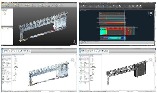 When the as-built BIM data were generated using point cloud data, multiple software programs were used. Autodesk’s ReCap, Revit, Plant3D, and Civil3D; Trimble’s Realworks and Tekla; Intergragh’s PDS and Smart Plant3D, Leica’s Cyclone and CloudWorkx; and Faro’s PointSense Plant provide solutions for the management, adjustment, analysis, simulation, automatic modeling, and 3D modeling of point cloud data so that the status of facilities can be easily modeled [53]. In this study, the as-built BIM data were generated through Revit using point cloud data because connection to model generation for structural analysis and the structural analysis task, which are follow-up tasks, was considered as the safety diagnosis of the status of the facilities was the final objective.