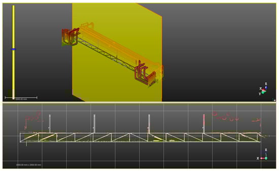 - The laser scanning data and the BIM model should be integrated on the basis of specific coordinates to more accurately analyze the results of the external condition of the large-scale civil infrastructure [18,26]. The integrated 3D model is used to determine the degree of displacement through cross-sectional analysis.