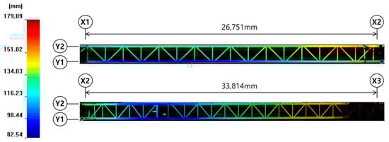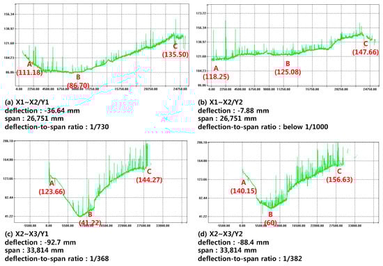 Figure 12 shows the structural safety diagnosis results for the deflection of the truss. The values of points A, B, and C shown in Figure 12 indicate the level difference (z value difference) between laser scanning data and BIM model at each position. The magnitude of deflection and deflection-to-span ratio were calculated by the following Equations (1) and (2). Based on these results, the structural engineer evaluates the structural safety of large-scale civil infrastructure. Based on these results, a follow-up repair and reinforcement plan will be established.