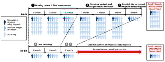 Dongyang Structural Engineers Group introduced laser scanning to improve the structural safety diagnosis service of the facility. The purpose of introducing these latest technologies is to improve service quality, reduce input costs, shorten the service period, and secure worker safety. As a result of the interview with the structural engineer who manages the case project, it was confirmed that the manpower input is reduced as shown in Figure 14.