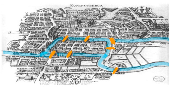 A map of 18th-century Königsberg, with its seven bridges, highlighted [35].