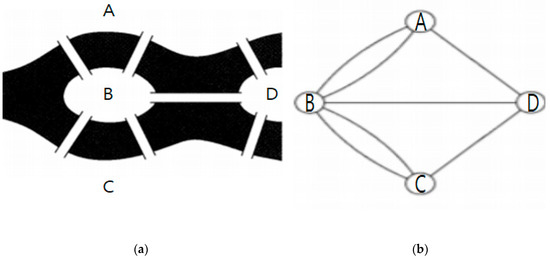 (a) a simplified depiction of the pattern of the rivers and bridges in the Königsberg bridge problem [35]; (b) the corresponding network of vertices and edges [35].