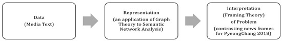Framing is “to select some aspects of a perceived reality and make them more salient in a communicating text” [27] (p. 52). Framing’s distinctive aspects come out of its applicability effects [28]. This effect becomes valid when the audiences accept the message exposed by the media [28]. For instance, if the news message suggested a framing about the connection between tax policy and unemployment rates, the audience might consider about the applicability of unemployment rates to tax issues [29]. In other words, issue salience from the media has a certain amount of impact upon the audience’s process of cognition process. Based on this theoretical base, this paper explores how representative media in South Korea framed PyeongChang 2018 in connection to the peace and security issue of the Korean peninsula. Then, the media framings are composed with the South Korea’s public opinion to the issue. D’Angelo’s study presents the algorithm of frame construction flow, framing effects flow and frame definition flow (Figure 3) [30]. This study suggests the importance of diversified methods of framing analysis [30]. In this regard, automated semantic network analysis can be one of the helpful approaches showing how the framings were constructed and connected to each other from the working out the constellation of the groups of the salient words in the news texts.