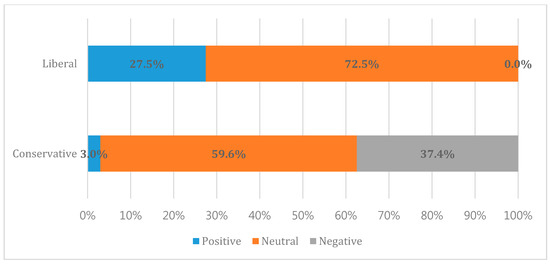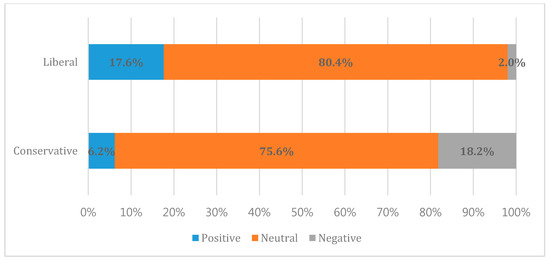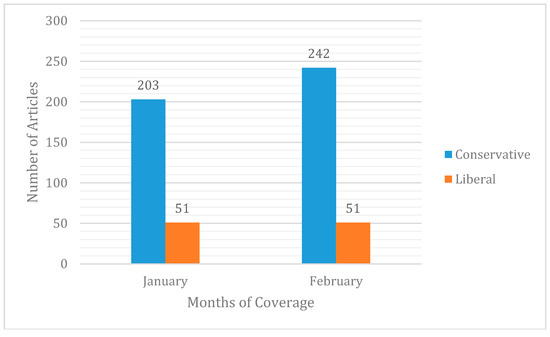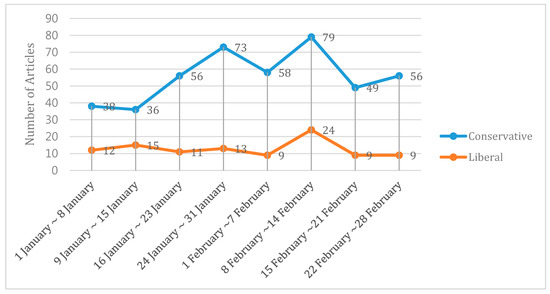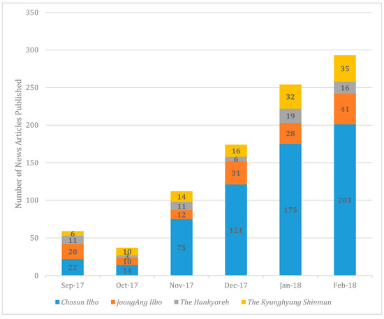 First of all, it is useful to look at the number of articles these two groups of newspapers published (Figure 4). In January, a total of 254 articles were released on PyeongChang 2018 (203 by conservative and 51 by liberal media). In February, the Olympic month, a total of 293 articles (15% more than the previous month) were published (conservative: 242, liberal: 51). Given the quantity of article published (Figure 8), we were able to find out three findings. First, the conservative newspapers’ editorials seemed to pay more interests towards PyeongChang 2018 than the liberal ones. Second, the conservative newspapers’ editorials seem to have temporarily allocated more resources for covering PyeongChang 2018. Korean newspapers generally have a flexible resource management system to flexibly cover any issues if necessary [55]. In other words, when the agents want to cover a certain issue more, the editorial board invests more resource in reporting PyeongChang 2018. Third, based on their huge circulation (Table 3), the conservative newspapers should have attempted to influence public opinion by approaching the subscribers.