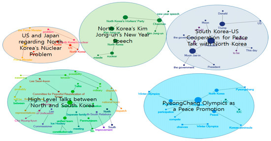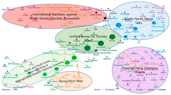In Figure 14, the framings related to North Korea were salient in the texts of the conservative newspapers. They mainly addressed the events of PyeongChang 2018—South Korean female curling team and unified Korean female ice hockey team. Table 5 indicates that “female curling team” bears the high value of betweenness centrality in the conservative newspapers. In Figure 11, we were able to find out liberal newspapers focused on covering the PyeongChang 2018 as a peace-promotion event. Table 5 shows that “ice hockey team” bears the high value of betweenness centrality in the liberal newspapers.