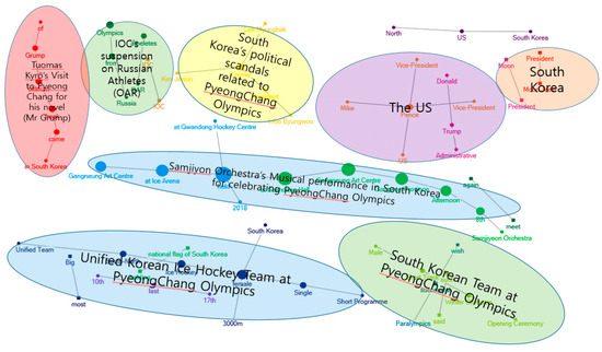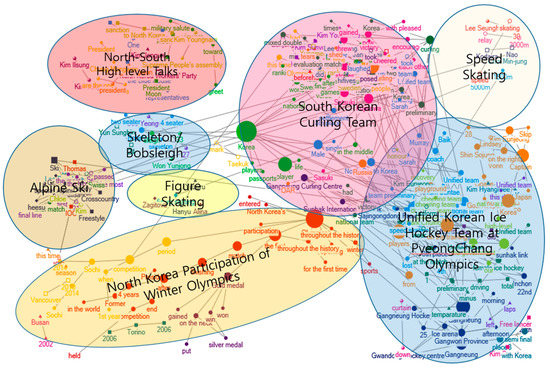 The contribution of this study lies in providing a new interpretation to PyeongChang 2018 based on semantic networks extracted from news media texts. Empirical studies on Pyeongchang 2018 have touched upon event preparation or civic participation. Especially, in 2011, when the hosting the PyeongChang Olympics was confirmed, most studies were conducted in order to prepare a plan for regional development by analysing the hosting environment of the PyeongChang Olympics [2,3,4,5,6]. Alternatively, in the preparation of hosting the PyeongChang Olympics, the regional residents’ willingness to cooperate can have a positive influence in terms of regional development and the diffusion of sport culture [7]. However, there is no study on the media attitudes and their subsequent formation of public opinion about this event. In this vein, this study can be timely and significant to some extent. By conducting semantic network analysis, this study can suggest another novel way of interpreting this event. Semantic network analysis seeks to explore what are the keywords in the media discourse (vertices) and their relations among themselves (edges) [8]. Semantic network analysis is a standardised method of extracting essential representations from huge amount of unstructured data [8]. Hence, the research outcomes of this study can suggest extended interpretation of this event in social context and structure (Figure 2).