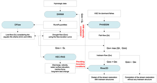 Figure 2 shows a flow chart of the numerical model input and the output data to determine the ecological stream restoration planning with respect to not only the hydrologic aspect but also the ecological one. The drought flow () is computed by evaluating the hydrologic data (i.e., the analysis of flow-duration curve) that are input into the SWMM; it is a mathematical model for simulation of urban runoff quantity and quality in natural stream and storm and combined sewer system. DFLOW determines the low-flow () that satisfies the aquatic life criteria (i.e., CCC and CMC). The calculated flow rate in SWMM is used as the input boundary condition of the Hydrologic Engineering Center River Analysis System (HEC-RAS) Version 4.1.0 (US Army Corps of Engineers, Hydrologic Engineering Center, Davis, CA, USA) [32] to calculate the boundary condition of water surface elevation at the desired location. The water surface elevation calculated by HEC-RAS can be entered as input as a downstream boundary condition for PHABSIM. The upstream boundary condition of PHABSIM is also entered for the calculated flow rate from SWMM. Furthermore, the HEC-RAS can estimate the bed condition, such as fixed or movable bed, for sediment transport using the simulation result of long-term bed change. The PHABSIM computes the fish flow () using the HSC for dominant fishes. If drought flow is equal to or greater than low-flow, we can determine the larger value as instream flow () by comparing drought flow and fish flow. However, if the drought flow is less than the low-flow, an amount that exceeds the drought flow must be secured using structural measures of the IWM. Finally, the boundary condition of River2D is also entered using the output of HEC-RAS in the same way as PHABSIM. When the drought flow is less than instream flow, in the hydraulic respect, the shortage of instream flow can be compensated by installing instream structures evaluated by the River2D without any increase in instream flow at the site where instream flow is insufficient.
