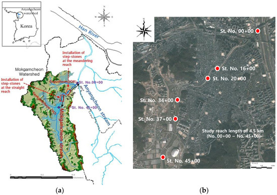 Map of the Mokgamcheon watershed in Korea: (a) Mokgamcheon watershed; (b) base map of the study area (station No. 00+00–No. 45+00). For instance, station No. 45+00 is at a point 4500 m from the outlet of the Mokgamcheon stream, and station No. 00+00 is at the outlet of the Mokgamcheon stream.