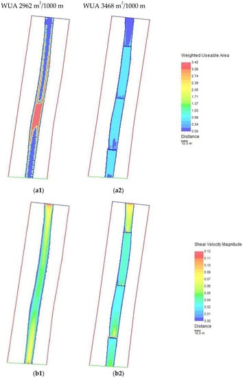 Simulated results at the straight channel reach (No. 37+00–No. 34+00): (a1) WUA of Zacco platypus on adult season without any instream structure; (a2) WUA of Zacco platypus on adult season with stepping stones; (b1) WUA of Carassius auratus on adult season without any instream structure; (b2) WUA of Carassius auratus on adult season with stepping stones; (c1) shear velocity magnitude without any instream structure; (c2) shear velocity magnitude with stepping stones.