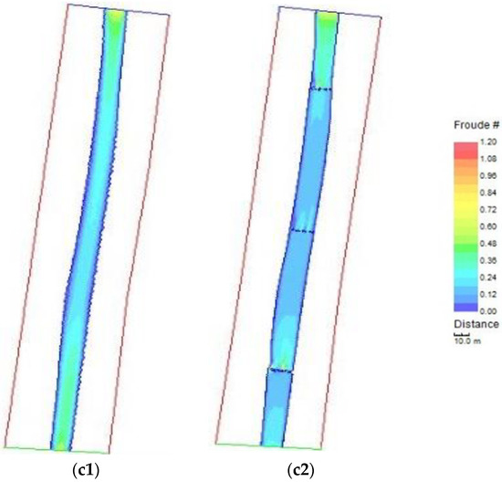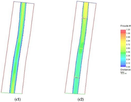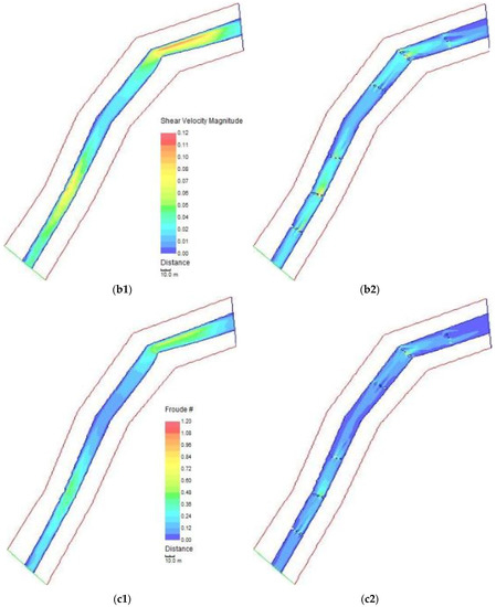 The adequacy of the habitat simulation was assessed through the evaluation of hydraulic factors. The results of the River2D simulation are presented in Table 11 and Table 12 and Figure 6 and Figure 7 at each reach of the straight and meandering channels. For the installation layouts of the stepping stones, the observation positions of the Froude numbers and shear velocities (A1–A3 and B1–B7) are shown in Figure 5a,b.