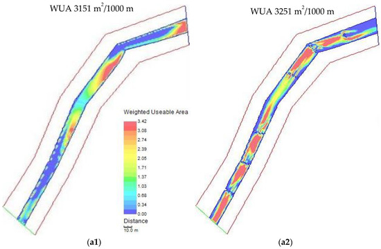 The results of River2D by the flood discharge in September showed that the WUA conditions without any instream structure (Figure 9a1,b1) were slightly greater than if the stepping stones were installed (Figure 9a2,b2). In the absence of stepping stones, shelters were created for fish to be evacuated along riverbank as the velocities in the middle of the stream were very high, as shown in Figure 9c1,c2. When a large flood occurred and stepping stones were installed, the areas of the shelter were relatively smaller than when there were no stepping stones installed because of faster flow around the stepping stones. The stepping stones were submerged by floods, and velocities in the middle of the stream and around stepping stones were very fast, as shown in Figure 9c2. However, for some fishes, safety is ensured through vertical migration in stream to use the hyporheic zone of stream bed as a shelter [38]. Therefore, additional measures will be needed to create shelter for fishes to be evacuated. However, according to the theory of nature’s pulsing paradigm, if the structure is not destroyed, the pulse, such as a flood of medium frequency and amplitude, leads to the biodiversity and productivity of the ecosystem [39,40]. Even if the stepping stones are destroyed, it will provide a space as another natural ecological habitat.