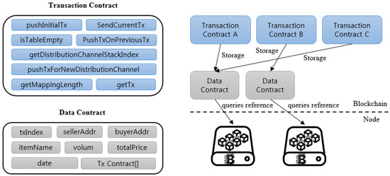 A transaction contract is a contract that collects functions for trading. PushInitialTx is used to store transactions when the distribution route table is empty and SendCurrentTx operates in a different manner, depending on whether transactions are stored in the distribution route table. If there is no previous transaction, a stack is created and stored in the distribution route table. If there is a transaction, it is stored on the stack that represents the distribution channel in which the previous transaction exists. isTableEmpty verifies whether the table is empty, pushTxOnPreviousTx judges whether there is a previous transaction, and if so, that transaction is saved. getDistributionChannelStackIndex retrieves information about the item and displays it to the consumer when inputting the item or when inquiring the retail price. pushTxForNewDistributionChannel stores the user’s current transaction. getMappingLength stores the transaction after determining the size of the table to add a new distribution path. getTx retrieves the transaction information at the specified location in the distribution route table and displays it to the consumer.