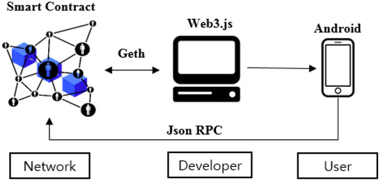 Figure 9, Geth, an Ethereum-network-based client program, was used to implement this application and React Native was used to work, using JavaScript in an Android environment. For communication, Web3.js, a JavaScript library, was used to implement the test bed to use JSON RPC. Solidity, a scripting language, was used to control the functions of the smart contract.