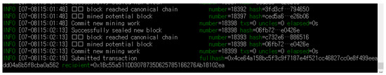 Figure 15 occurs in the common node synchronized through the application service of the company node. In this case, it is not immediately known what transaction has taken place, but one can see a transaction in the newly connected block. By checking the information inside the block through the command, one can obtain information regarding the transaction that has occurred.