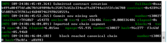 Figure 15 shows the screen that appears when a Company that operates on a Windows server as OS creates and compiles a proposed smart contract in the company node and registers it in the blockchain network. The screen informs that the smart contract is created, creates a transaction, and broadcasts it to other nodes. At this time, it is possible to know in which block the smart contract generated is registered.